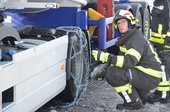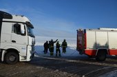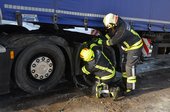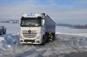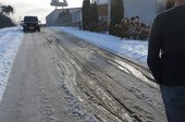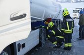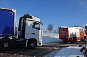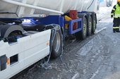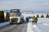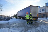 Der erste LKW, der mit ARGON (22-1951) beladen war, fuhr aus einer Betriebsausfahrt auf die Nebenstraße ein und blieb am eisigen Untergrund hängen. Nach dem Anlegen einer Schneekette, unter Mithilfe der Feuerwehrkameraden, konnte der Sattelzug selbstständig die Steigung bewältigen.