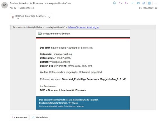 Kürzlich glaubte die Feuerwehr Meggenhofen, ein Schreiben vom Finanzamt mit der Aufforderung, einen ausstehenden Betrag einzahlen zu müssen, erhalten zu haben.