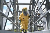 Unter chemikalienfesten Schutzanzügen (Schutzstufe 3) wurde versucht, das Rohr bzw. die Flansche dicht zu bekommen. Natürlich stellte sich diese Aufgabe als nicht so einfach dar.