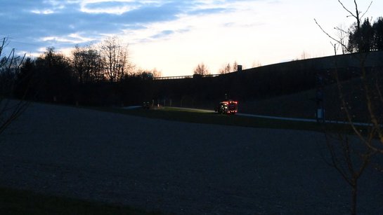 Die Besatzung von Pumpe Meggenhofen barg die unter dem Traktorgewicht eingeklemmte Person und löschte im Anschluss den Entstehungsbrand mittels UHPS.