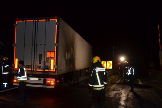 Anmerkung der Feuerwehr: Der Kühlaufbau hat ebenfalls zur Verhinderung der Brandausbreitung beigetragen. Ein Planen-LKW wäre sicherlich schneller in Brand geraten.